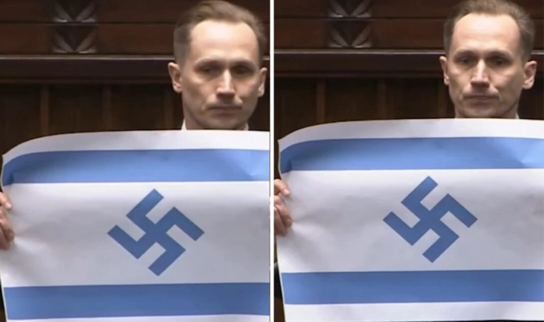 Polish MP Konrad Berkowicz compares Israel’s crimes against humanity to those of the Third Reich and displays an Israeli flag with a swastika.