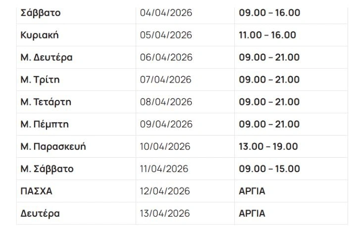 Τη Μεγάλη Παρασκευή 10/4, τα καταστήματα θα λειτουργήσουν από τις 13:00 έως τις 19:00, ενώ το Μεγάλο Σάββατο 1/4 από τις 10:00 έως τις 16:00.