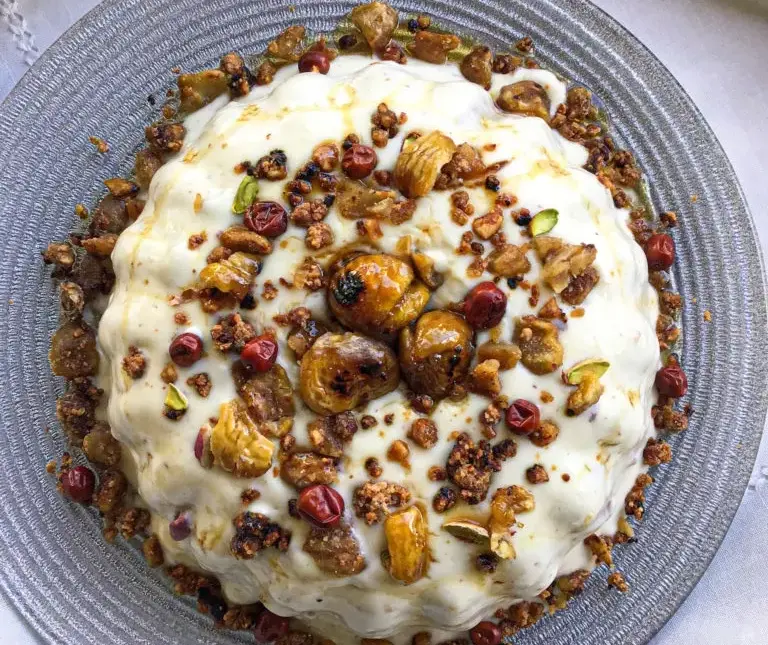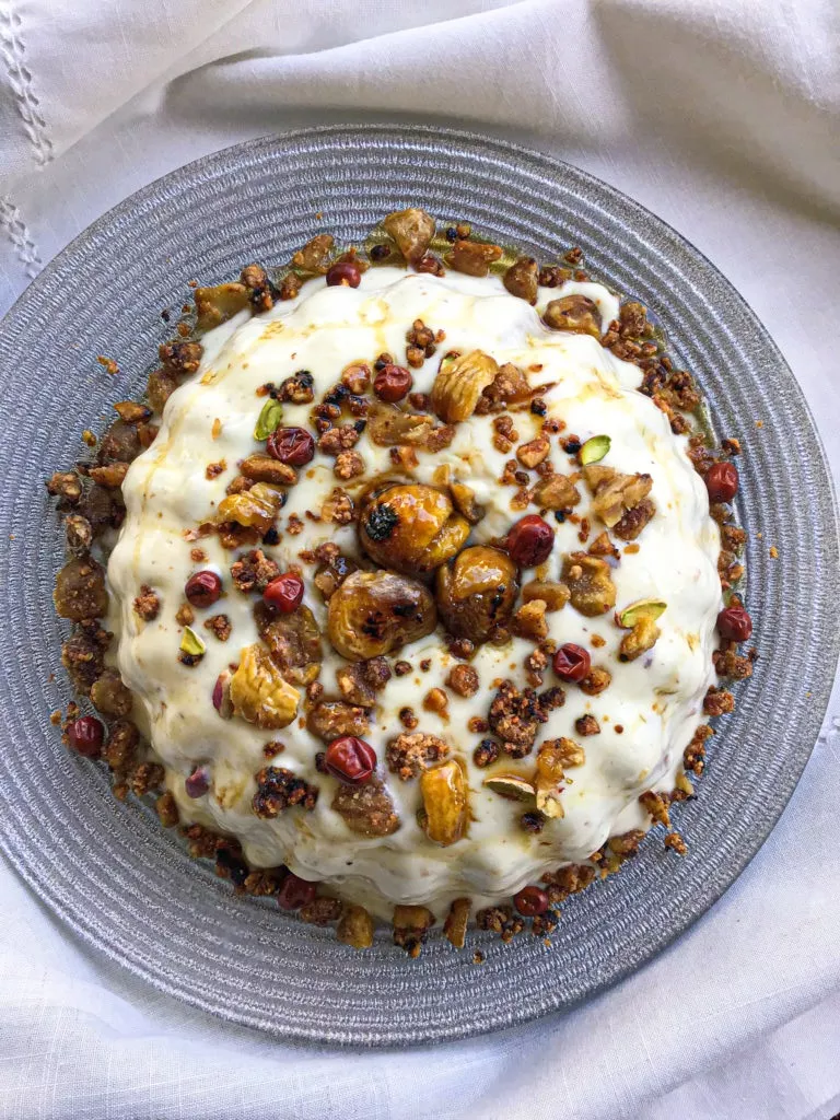Συναρμολόγηση: Αφήνουμε το σιροπιασμένο παντεσπάνι να κρυώσει εντελώς και το αναποδογυρίζουμε σε μια βαθιά πιατέλα, ώστε να συγκρατήσει την κρέμα. Απλώνουμε την κρέμα ομοιόμορφα πάνω από την επιφάνεια, δημιουργώντας μια σταθερή στρώση, και ολοκληρώνουμε διακοσμώντας με καβουρντισμένα κάστανα, αμύγδαλα, φουντούκια, τζίτζιφα (αν υπάρχουν) και ρόδια, που προσθέτουν υφή και φρεσκάδα στο γλυκό.