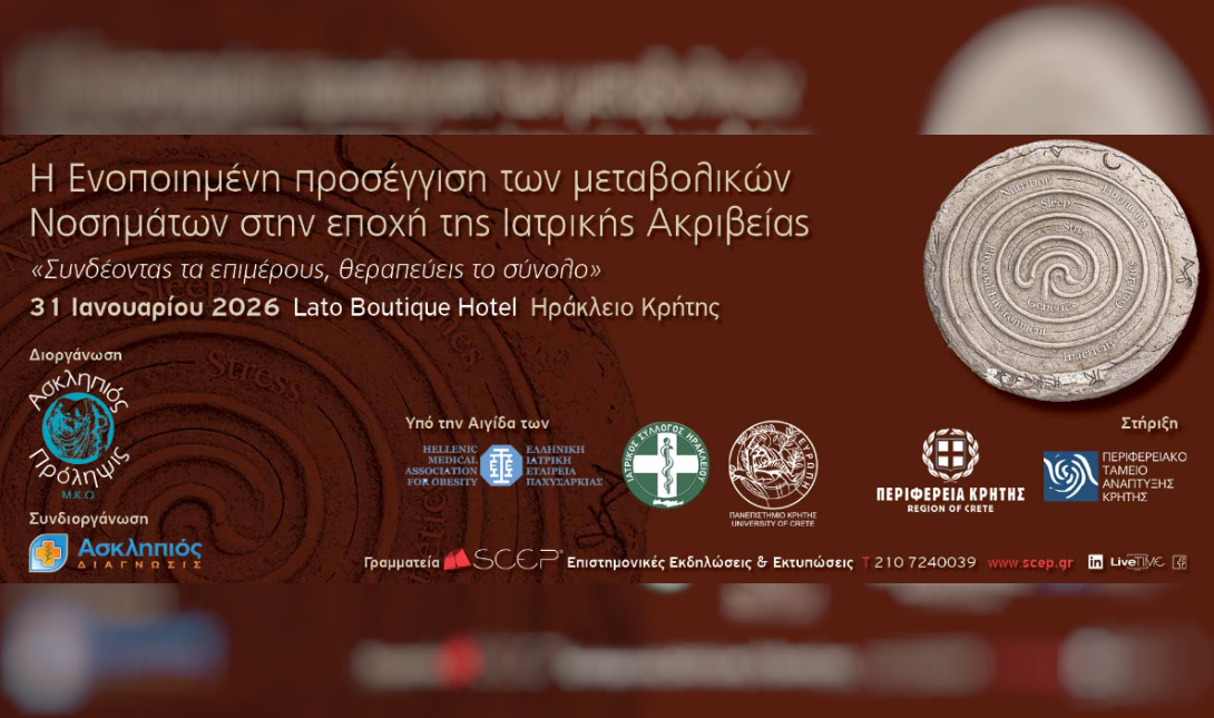 Με επιτυχία ολοκληρώθηκε η επιστημονική ημερίδα με τίτλο «Η Ενοποιημένη Προσέγγιση των Μεταβολικών Νοσημάτων στην εποχή της Ιατρικής Ακρίβειας – Συνδέοντας τα επιμέρους, θεραπεύεις το σύνολο», που πραγματοποιήθηκε στις 31 Ιανουαρίου 2026 στο Lato Boutique Hotel στο Ηράκλειο Κρήτης και αποτέλεσε μια σημαντική πλατφόρμα για την παρουσίαση και συζήτηση των τελευταίων εξελίξεων στον τομέα των μεταβολικών νοσημάτων και των σύγχρονων θεραπευτικών προσεγγίσεων.