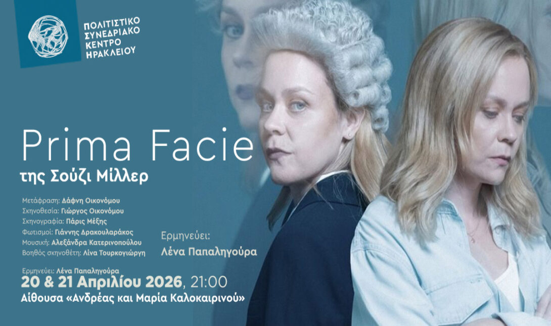 - Η παράσταση "Prima Facie" της Σούζι Μίλλερ θα παρουσιαστεί στο Ηράκλειο στις 20 και 21 Απριλίου 2026.