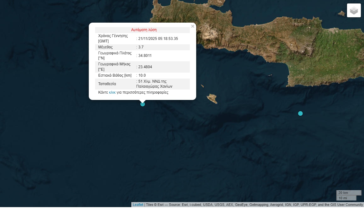 Σύμφωνα με την Αυτόματη Λύση του Γεωδυναμικού Ινστιτούτου, ο σεισμός σημειώθηκε στις 7:18 π.μ. στη θαλάσσια περιοχή 51 χιλιόμετρα νότια – νοτιοδυτικά της Παλαιόχωρας Χανίων.