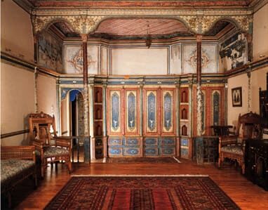 Το ξύλο γίνεται το κυρίαρχο δομικό και μορφολογικό στοιχείο του οικοδομήματος. Εξαιρετικά σημαντικές είναι οι διάφορες ξυλοκατασκευές στο εσωτερικό, όπως ταβάνια, μουσάντρες και διαχωριστικά πετάσματα, τα οποία αποτελούν χαρακτηριστικά δείγματα της αρχιτεκτονικής και αισθητικής αντίληψης που χαρακτηρίζει αυτή την ομάδα κτισμάτων. Ιδιαίτερο ενδιαφέρον παρουσιάζει ο ζωγραφικός διάκοσμος των κύριων εσωτερικών χώρων με τη θεματική του ποικιλία και τα ζωντανά χρώματα.