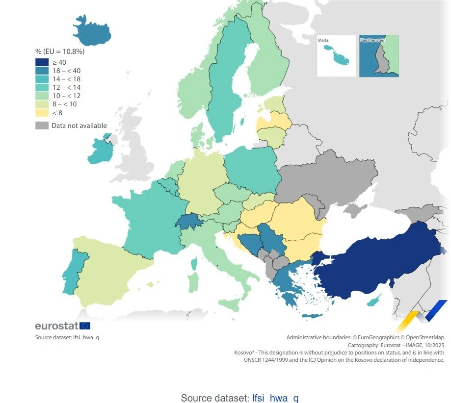 Συγκεκριμένα, σύμφωνα με στοιχεία της Eurostat για το δεύτερο τρίμηνο του 2025, το 20,9% των Ελλήνων εργαζομένων ηλικίας μεταξύ 20 και 64 ετών απασχολείται σε έναν ή σε περισσότερους εργοδότες, περισσότερες από 45 ώρες εβδομαδιαίως.