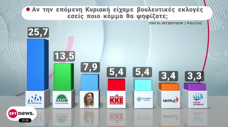 Δημοσκόπηση Interview: Προβάδισμα 12,2% της ΝΔ επί του ΠΑΣΟΚ – Στην 3η θέση το κόμμα Καρυστιανού
