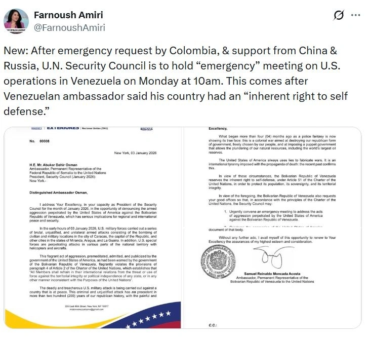 Υπενθυμίζεται πως, τόσο η μόνιμη αντιπροσωπεία της Μπολιβαριανής Δημοκρατίας της Βενεζουέλας, όσο και άλλες χώρες ζήτησαν το Σάββατο (3/1) να συνεδριάσει, μετά τη στρατιωτική επέμβαση στη Βενεζουέλα κατά τη διάρκεια της νύχτας και τη σύλληψη του προέδρου της χώρας, Νικολάς Μαδούρο, από τις αμερικανικές δυνάμεις.
