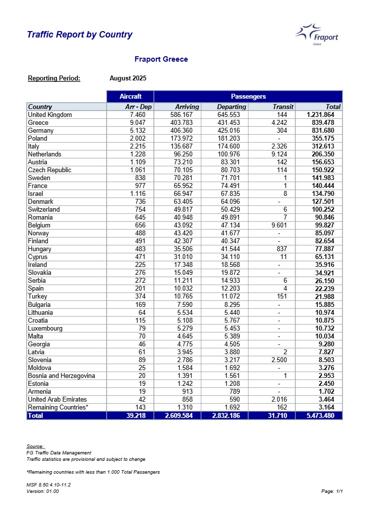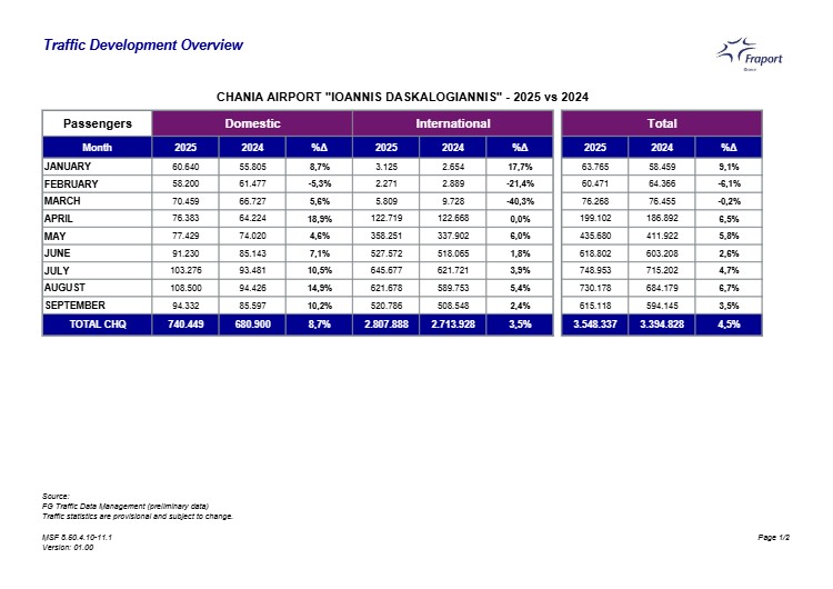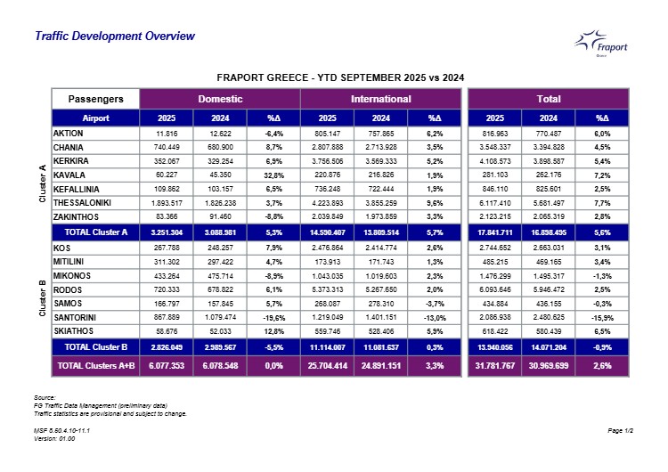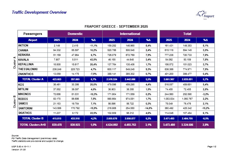 Συνολικά τον φετινό Σεπτέμβριο, τα αεροδρόμια υπό τη διαχείριση της Fraport Greece διακίνησαν 5.500.000 επιβάτες σε ένα μήνα, παρουσιάζοντας αύξηση 2,8% σε σύγκριση με τον ίδιο μήνα του 2024.