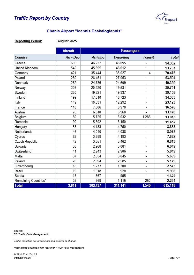 - Η επιβατική κίνηση στο Αεροδρόμιο Χανίων αυξήθηκε κατά 3,5% τον Σεπτέμβριο, με 10,2% αύξηση στις αφίξεις εσωτερικού.