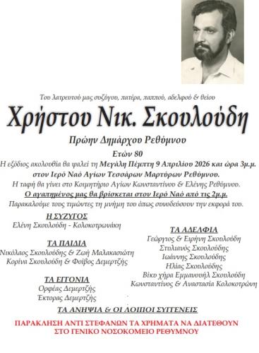 - Ο πρώην Δήμαρχος Ρεθύμνου, Χρήστος Σκουλούδης, απεβίωσε σε ηλικία 80 ετών, προκαλώντας βαρύ πένθος στην τοπική κοινωνία.