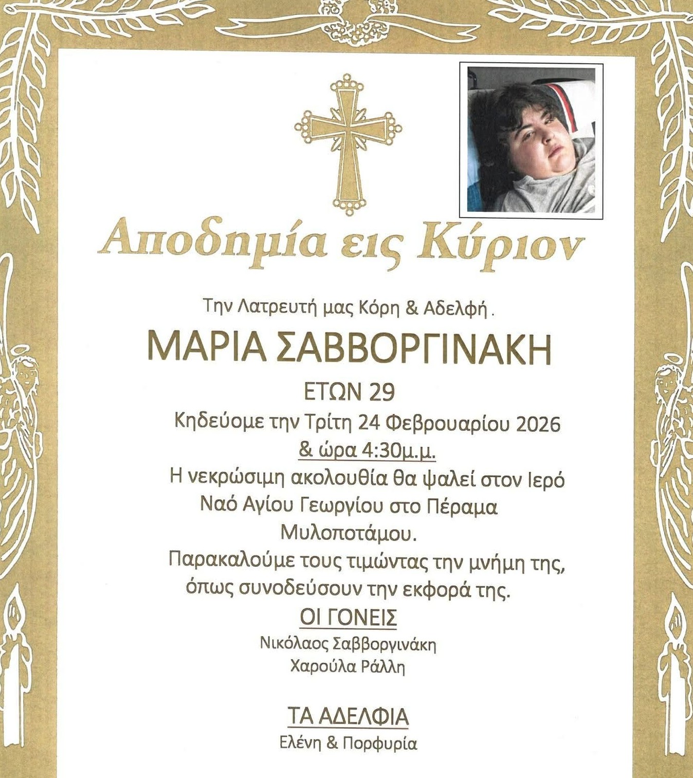 - Η Νεκρώσιμη Ακολουθία θα γίνει στον Ιερό Ναό Αγίου Γεωργίου στο Πέραμα Μυλοποτάμου.