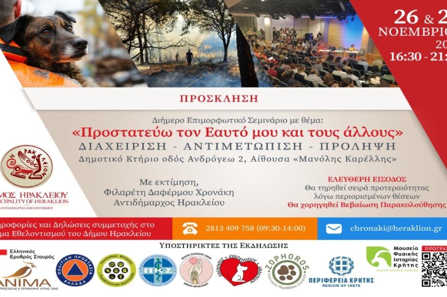 21.11.2025, 14:02 Ηράκλειο: Διήμερο επιμορφωτικό σεμινάριο με θέμα «Προστατεύω τον Εαυτό μου και τους άλλους»