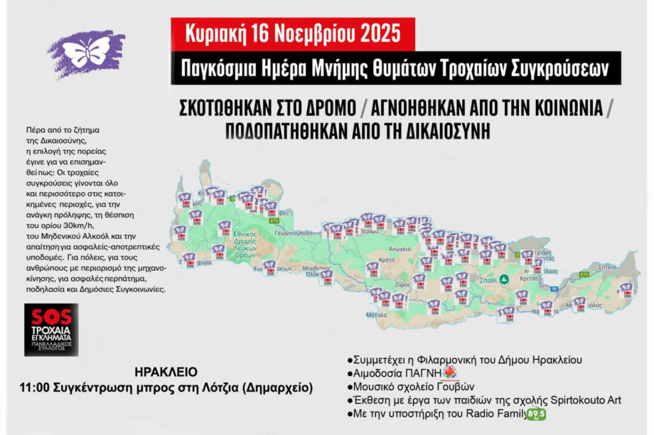 11.11.2025, 17:46 Ηράκλειο: Εκδηλώσεις ενόψει της Παγκόσμιας ημέρας μνήμης θυμάτων τροχαίων την Κυριακή 16/11