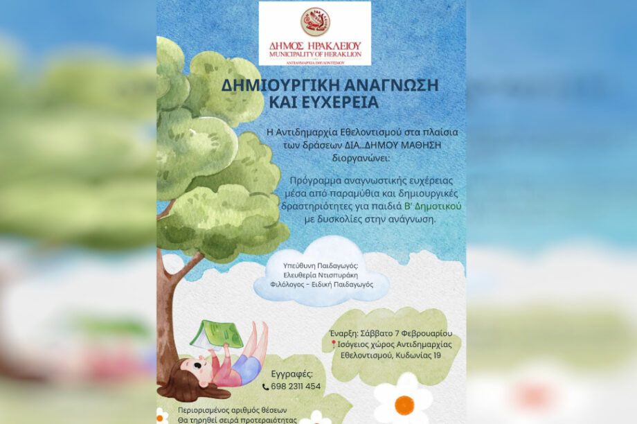 24.01.2026, 18:32 Ηράκλειο: Νέο πρόγραμμα δημιουργικής ανάγνωσης και ευχέρειας για παιδιά Β’ Δημοτικού στην «Διά Δήμου… Μάθηση»