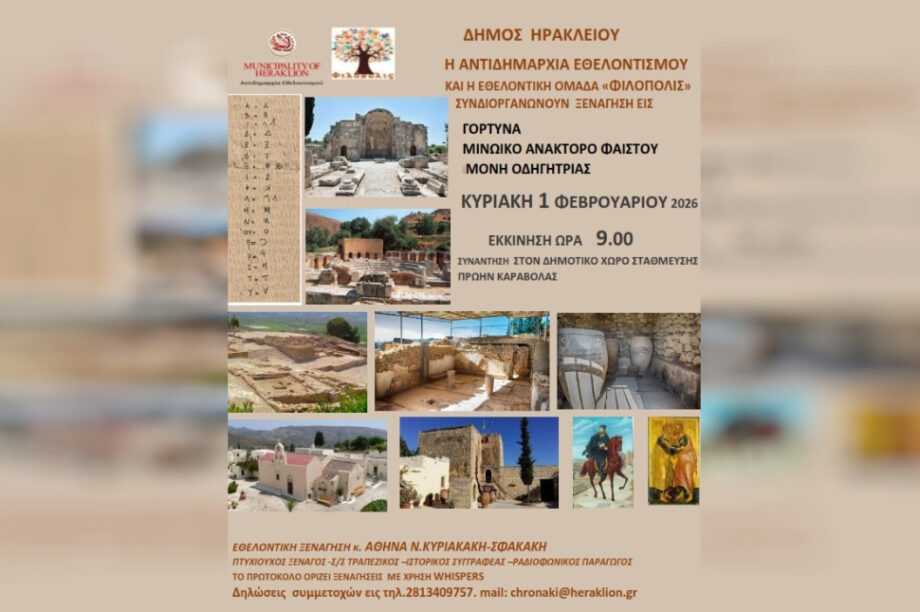23.01.2026, 14:30 Ξενάγηση σε Γόρτυνα, Φαιστό και Μονή Οδηγητρίας με τις «Χαρτοδιαδρομές» του Δήμου Ηρακλείου