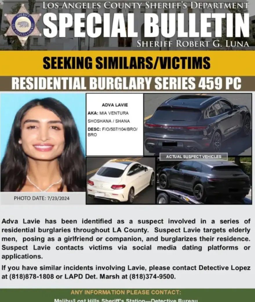 «Η ύποπτη έχει εμπλακεί σε μια σειρά διαρρήξεων κατοικιών σε ολόκληρη την κομητεία, στοχεύοντας ηλικιωμένους άνδρες, προσποιούμενη ότι είναι φίλη ή σύντροφος σε πλατφόρμες και εφαρμογές κοινωνικής δικτύωσης» ανακοινώθηκε από το αστυνομικό τμήμα του Λος Άντζελες προσθέτοντας ότι η 27χρονη κυκλοφορούσε «με ένα μαύρο SUV Porsche και ένα λευκό Mercedes-Benz sedan»,
