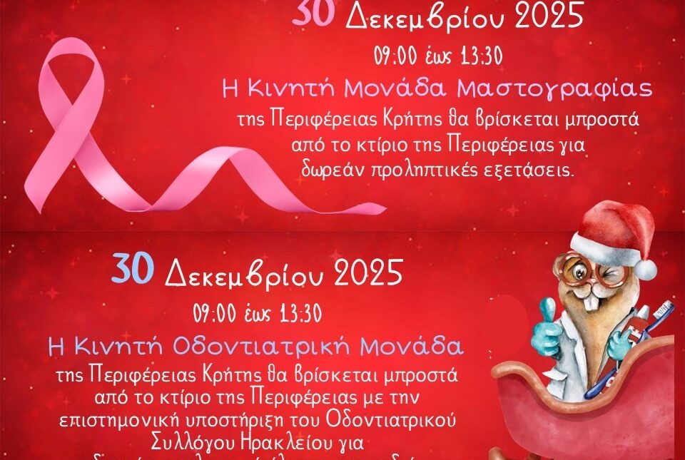 Η πρόληψη αποτελεί τον πιο αποτελεσματικό τρόπο προστασίας της υγείας μας, καθώς συμβάλλει στην έγκαιρη ανίχνευση προβλημάτων και στη μείωση κινδύνων που μπορεί να απειλήσουν την ποιότητα ζωής μας. Με αφορμή το εορταστικό κλίμα των ημερών, η Περιφέρεια Κρήτης καλεί τους πολίτες να αφιερώσουν λίγο χρόνο για τον εαυτό τους, συμμετέχοντας σε μία ημέρα που θα είναι αφιερωμένη στη φροντίδα και την ενημέρωση για την υγεία.
