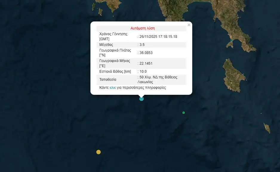 Σεισμική δόνηση μεγέθους 3,5 βαθμών της κλίμακας Ρίχτερ σημειώθηκε στη Λακωνία στις 7:18 το απόγευμα της Τετάρτης (26.11.2025).