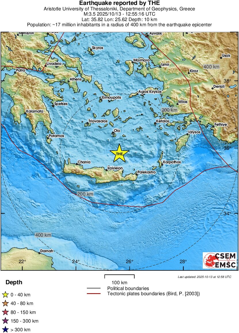 Σεισμική δόνηση μεγέθους 3,5 Ρίχτερ σημειώθηκε στις 15.55 το μεσημέρι της Δευτέρας στον θαλάσσιο χώρο βόρειο – βόρειο ανατολικά του Ηρακλείου.