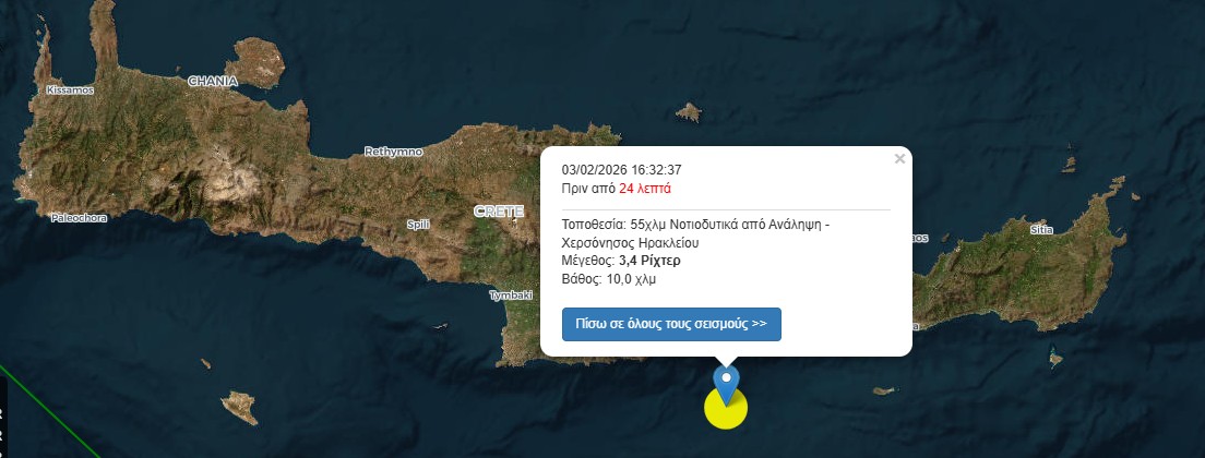 Σεισμική δόνηση 3,4 βαθμών της κλίμακας Ρίχτερ καταγράφηκε σήμερα, 03/02/2026, στις 16:32:37 το απόγευμα στην Ανάληψη – Χερσονήσου στο Ηράκλειο .