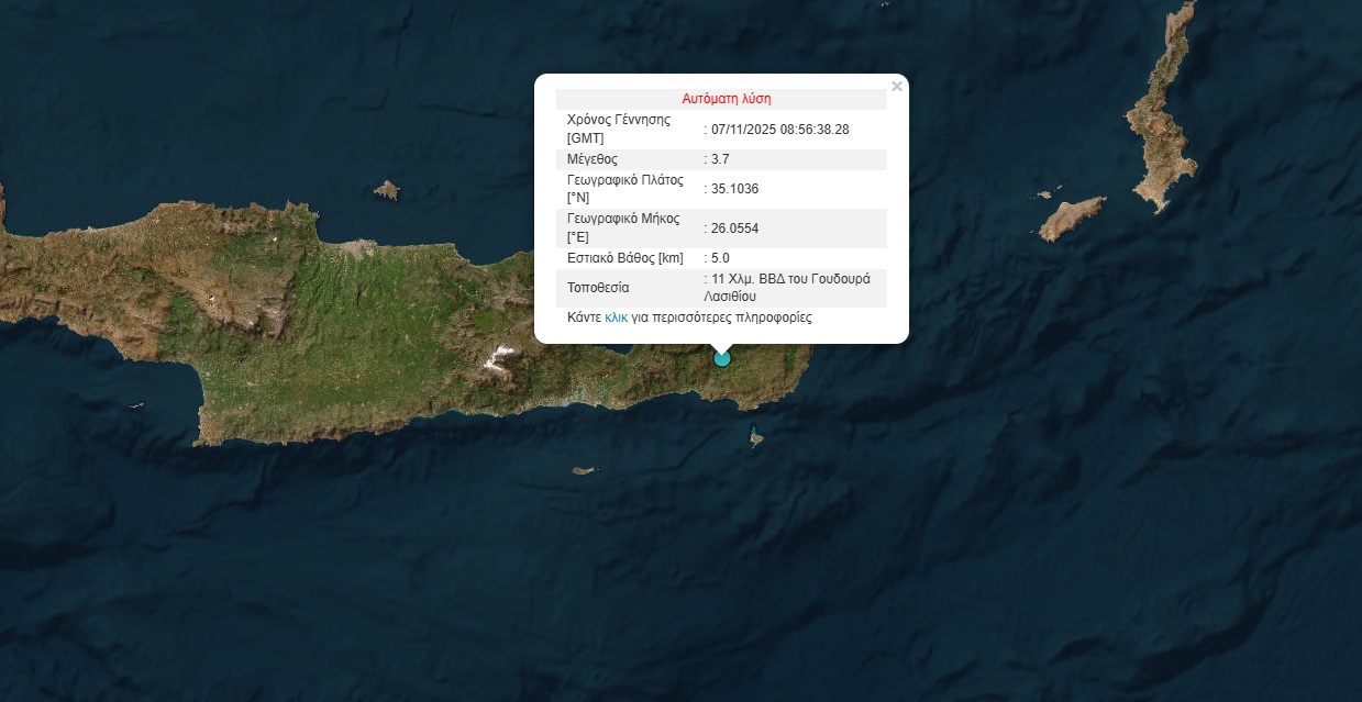 Σεισμός  3,7 Ρίχτερ σημειώθηκε στις 10.56 το πρωί της Παρασκευής (7/11), στο Λασίθι.  Συγκεκριμένα η δόνηση σημειώθηκε 11 χιλιόμετρα βόρεια βορειοδυτικά του Γουδουρά.