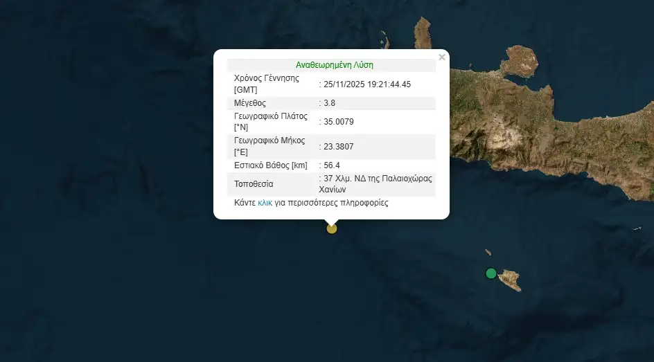 Ειδικότερα, ο σεισμός των 3,8 Ρίχτερ προέρχεται από τον θαλάσσιο εστιακό χώρο που βρίσκεται σε απόσταση 37 χιλιομέτρων νοτιοδυτικά της Παλαιοχώρας στα Χανιά.