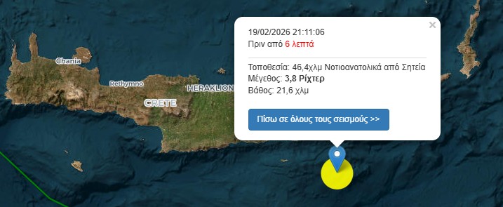 Σεισμός 3,8 Ρίχτερ σημειώθηκε στις 21:11 το βράδυ της Πέμπτης (19/2) στη θαλάσσια περιοχή ανοιχτά της ανατολικής Κρήτη.