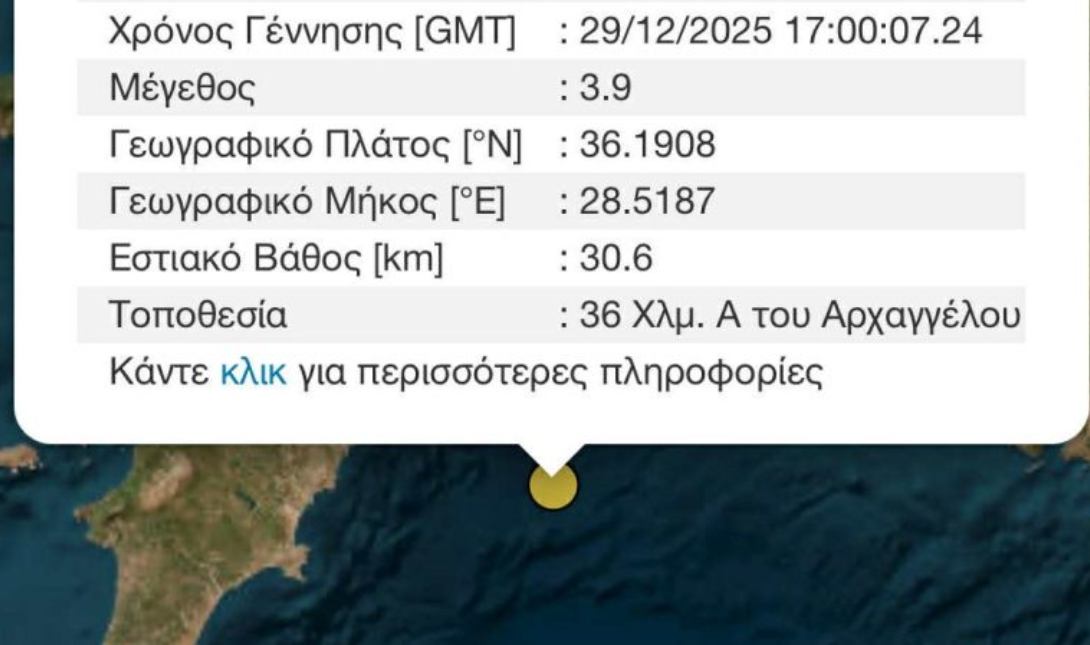 Σεισμική δόνηση, εντάσεως 3,9 Ρίχτερ, σημειώθηκε στη Ρόδο.
