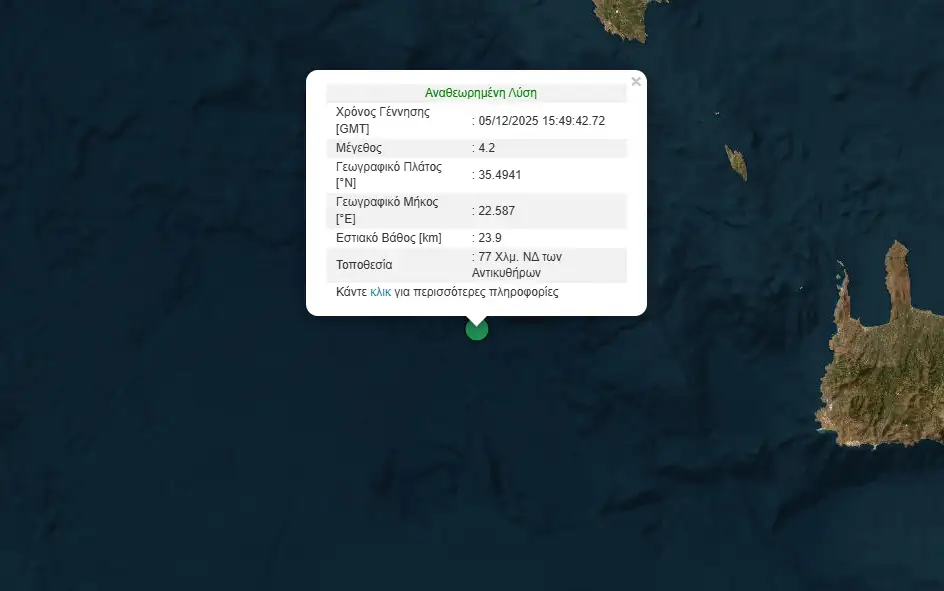 Σεισμός μεγέθους 4,2 βαθμών της κλίμακας Ρίχτερ σημειώθηκε στη θαλάσσια περιοχή ανάμεσα στη δυτική Κρήτη και τα Αντικύθηρα το απόγευμα της Παρασκευής (05.12.2025).