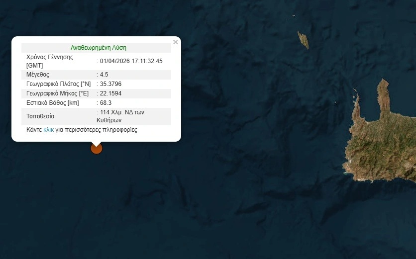Σεισμός μεγέθους 4,5 Ρίχτερ σημειώθηκε το απόγευμα της Τετάρτης (2/4) σε θαλάσσια περιοχή ανοικτά δυτικά της Κρήτης.