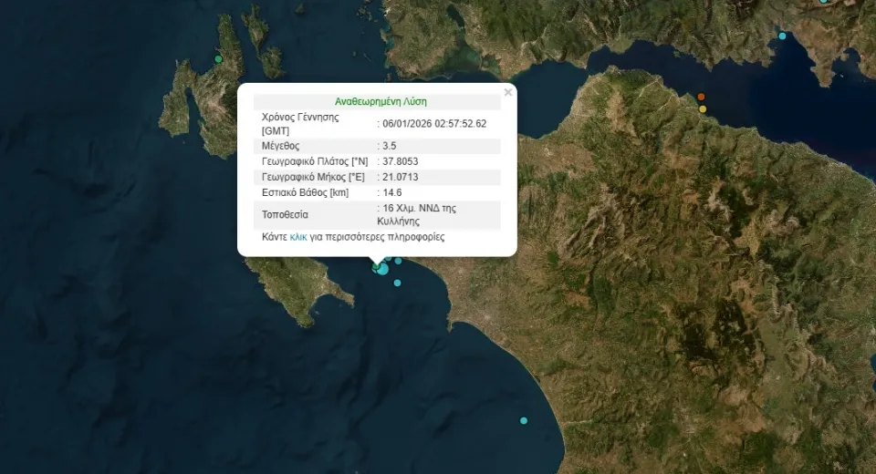 - Σεισμική δόνηση μεγέθους 3,5 Ρίχτερ καταγράφηκε κοντά στην Κυλλήνη Ηλείας.