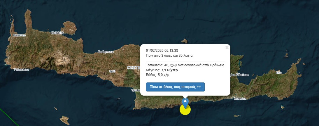 - Το επίκεντρο εντοπίστηκε 46,2 χιλιόμετρα νοτιοανατολικά του Ηρακλείου.