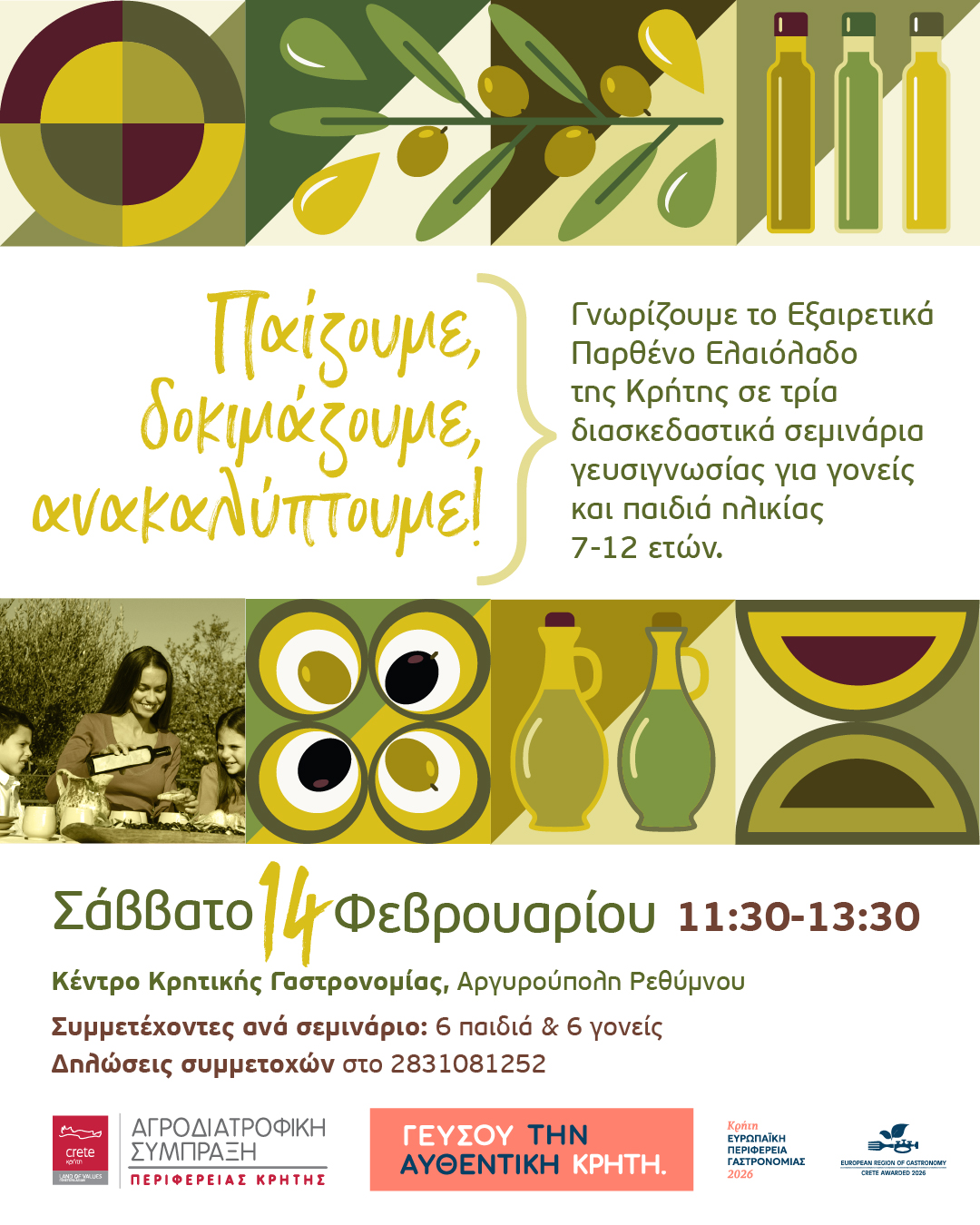 Στο πλαίσιο του 12ου Παγκρήτιου Διαγωνισμού Ελαιόλαδου και με αφορμή την ανάδειξη της Κρήτης ως Ευρωπαϊκή Γαστρονομική Περιφέρεια 2026, το Κέντρο Κρητικής Γαστρονομίας μεταμορφώνεται σε έναν χώρο εξερεύνησης, παιχνιδιού και γεύσης.