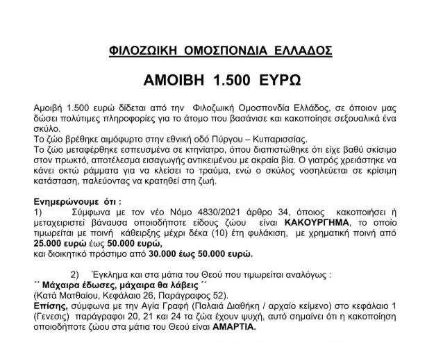 - Η Φιλοζωική Ομοσπονδία Ελλάδος προσφέρει αμοιβή 1.500 ευρώ για πληροφορίες που θα οδηγήσουν στη σύλληψη του δράστη.