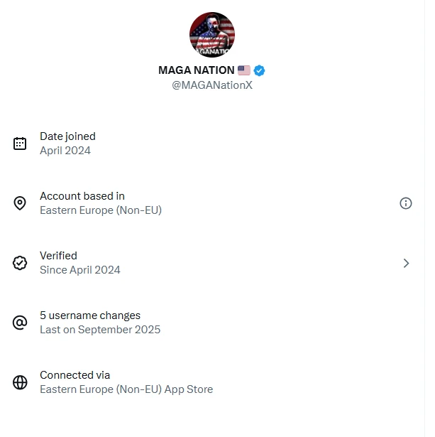 Αρκετοί γνωστοί λογαριασμοί που προωθούν μηνύματα υπέρ του κινήματος MAGA φαίνονταν, σύμφωνα με τη νέα λειτουργία, να εδρεύουν πολύ μακριά από τις Ηνωμένες Πολιτείες, σύμφωνα με το Business Insider.