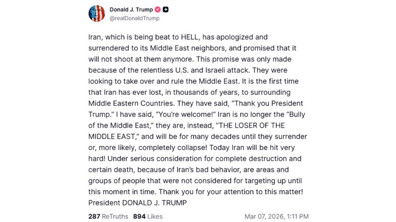 Σε ανάρτησή του στην πλατφόρμα Truth Social, ο Τραμπ υποστήριξε ότι η Τεχεράνη ζήτησε συγγνώμη από γειτονικές χώρες και υποσχέθηκε ότι δεν θα τις στοχοποιήσει ξανά.