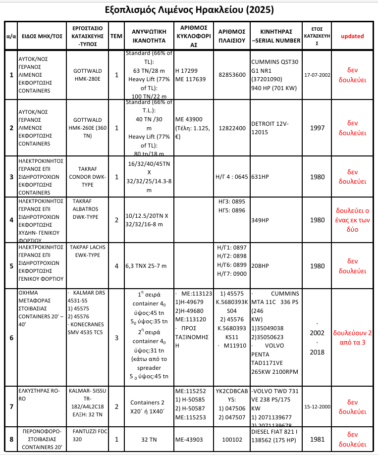 Στο χείλος της παράλυσης βρίσκεται το εμπορικό λιμάνι του Ηρακλείου, καθώς σύμφωνα με τα επίσημα στοιχεία για τον εξοπλισμό του 2025, μόλις ένας γερανός λειτουργεί μερικώς, ενώ το μεγαλύτερο μέρος του μηχανολογικού στόλου παραμένει εκτός λειτουργίας.