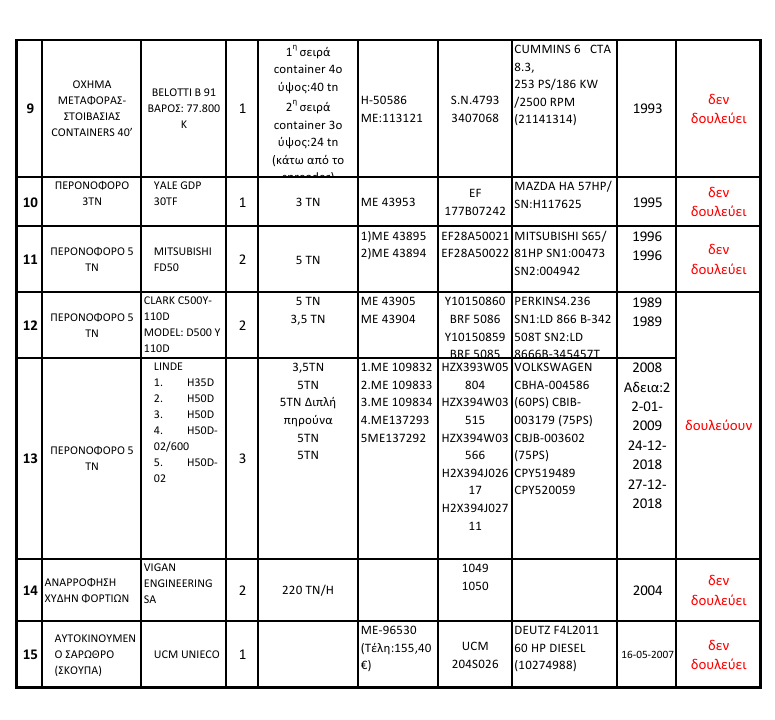 • Από τα εννέα περονοφόρα ανυψωτικά, μόνο τρία λειτουργούν κανονικά (τα νεότερα μοντέλα LINDE, κατασκευής 2008).