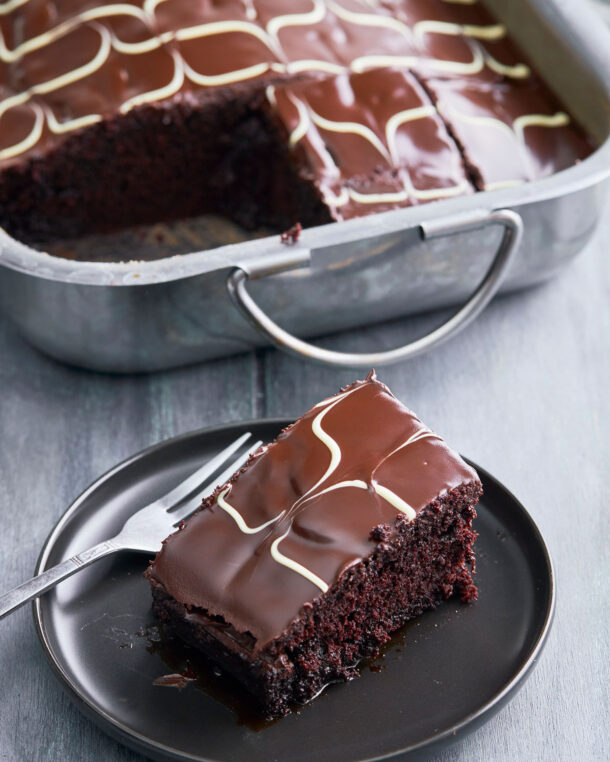 Η αγαπημένη σοκολατόπιτα! Το κέικ σιροπιάζεται με σοκολατένιο σιρόπι και καλύπτεται με γλάσο σοκολάτας.