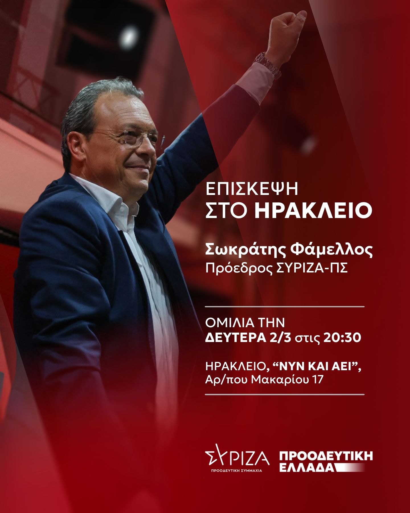Ο Πρόεδρος του ΣΥΡΙΖΑ-ΠΣ Σωκράτης Φάμελλος επισκέπτεται το Ηράκλειο τη Δευτέρα 02 Μαρτίου 2026 στα πλαίσια πολιτικών παρεμβάσεων με στόχο την οικοδόμηση μιας πλατιάς κοινωνικής και πολιτικής συμμαχίας για την «Προοδευτική Ελλάδα». Για μια Ελλάδα που θα σέβεται την αξιοπρέπεια των πολιτών στα πλαίσια μιας δικαιοκρατικής και δημοκρατικής αντίληψης άσκησης εξουσίας και απελευθέρωσης του δημιουργικού και αξιακού αποθέματος αυτού του τόπου.