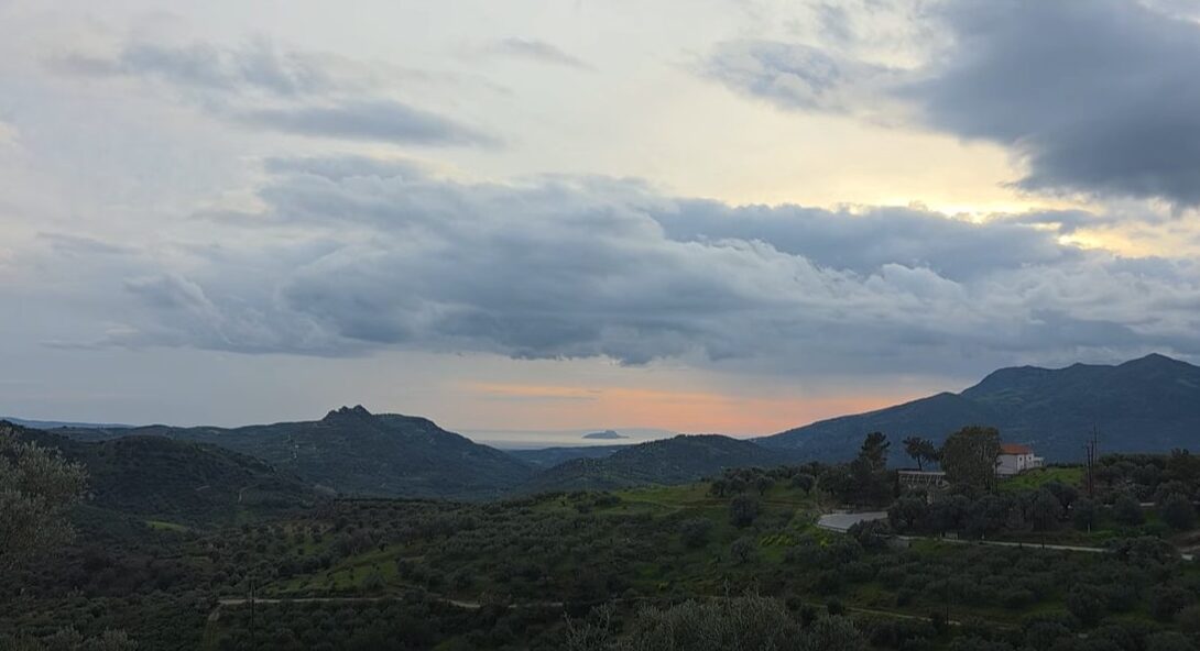 Στο βίντεο που καταγράφηκε περίπου στις 6 το απόγευμα, το βουνό «συνομιλεί» με τη θάλασσα και ο ορίζοντας γίνεται γέφυρα ανάμεσα σε τόπους και μνήμες.