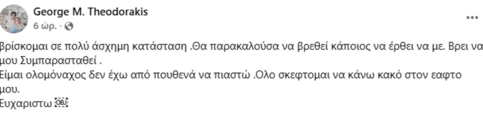 Εγραψε χαρακτηριστικά: «Βρίσκομαι σε πολύ άσχημη κατάσταση. Θα παρακαλούσα να βρεθεί κάποιος να έρθει να με βρει να μου συμπαρασταθεί. Είμαι ολομόναχος δεν έχω από πουθενά να πιαστώ. Όλο σκέφτομαι να κάνω κακό στον εαυτό μου. Ευχαριστώ».