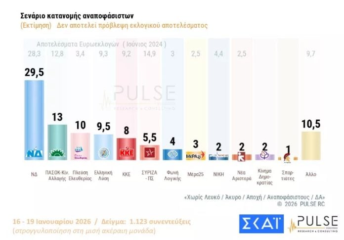 Στο σενάριο κατανομής αναποφάσιστων, η Νέα Δημοκρατία διατηρεί καθαρό προβάδισμα με 29,5%, επιβεβαιώνοντας τη θέση της ως κυρίαρχη πολιτική δύναμη. Ακολουθεί το ΠΑΣΟΚ– Κίνημα Αλλαγής με 13%, ενώ η Πλεύση Ελευθερίας (10%) και η Ελληνική Λύση (9,5%) καταγράφουν αξιοσημείωτες επιδόσεις. Το ΚΚΕ συγκεντρώνει 8%, ενώ ο ΣΥΡΙΖΑ – ΠΣ περιορίζεται στο 5,5%, γεγονός που υπογραμμίζει τη συνεχιζόμενη δυσκολία του να ανακάμψει εκλογικά.