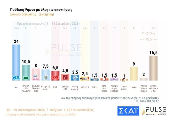 Στην πρόθεση ψήφου με όλες τις απαντήσεις, η Νέα Δημοκρατία παραμένει πρώτη με 24%, ωστόσο το ποσοστό των αναποφάσιστων και όσων δηλώνουν αποχή ή λευκό/άκυρο παραμένει υψηλό, στοιχείο που αφήνει ανοιχτό το ενδεχόμενο μεταβολών το επόμενο διάστημα.