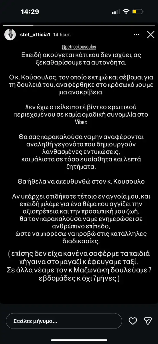 Και συνεχίζει: «Θα ήθελα να απευθυνθώ στον κ. Κούσουλο. Αν υπάρχει οτιδήποτε τέτοιο εν αγνοία μου, και επειδή μιλάμε για ένα θέμα που αγγίζει την αξιοπρέπεια και την προσωπική μου ζωή, θα τον παρακαλούσα να με ενημερώσει σε ανθρώπινο επίπεδο, ώστε να μπορέσω να προβώ στις κατάλληλες διαδικασίες. (Επίσης δεν είχα κανένα σοφέρ, με τα παιδιά πήγαινα στο μαγαζί και έφευγα με ταξί. Σε άλλα νέα, με τον κ. Μαζωνάκη δουλεύαμε 7 εβδομάδες και όχι 7 μήνες)».