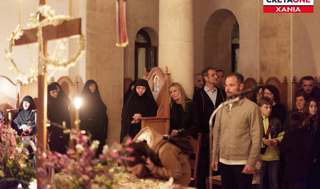 Μαζί του βρέθηκε η σύζυγός του, Μαρέβα Γκραμπόφσκι-Μητσοτάκη, ενώ η παρουσία τους πραγματοποιήθηκε σε κλίμα κατάνυξης, με φόντο το πασχαλινό τελετουργικό στην Κρήτη.