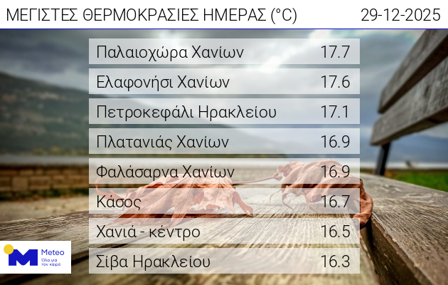 Πιο αναλυτικά, η μέγιστη θερμοκρασία καταγράφηκε στην Παλαιόχωρα με 17,7 βαθμούς Κελσίου ενώ ακολουθούν το Ελαφονήσι με 17,6, το Πετροκεφάλι Ηρακλείου με 17,1, ο Πλατανιάς Χανίων με 16,9, το κέντρο Χανίων με 16,5 και ο Σίβας Ηρακλείου με 16,3 βαθμούς Κελσίου.