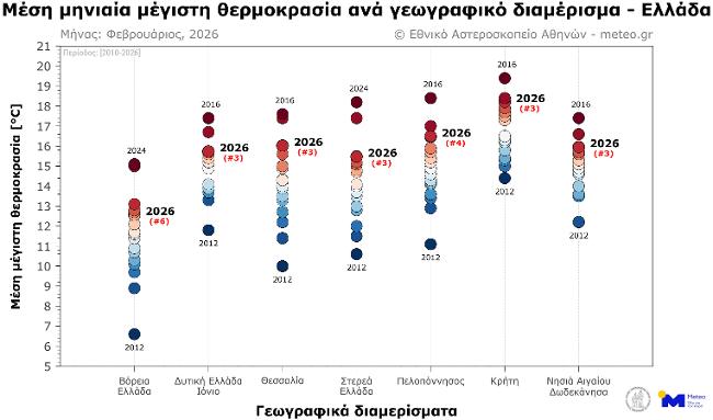 Σύμφωνα με το δίκτυο των 53 μετεωρολογικών σταθμών του meteo.gr του Εθνικού Αστεροσκοπείου Αθηνών (Ε.Α.Α.), που λειτουργούν ανελλιπώς από το 2010 έως σήμερα, τον Φεβρουάριο του 2026 η μέση τιμή των μεγίστων ημερήσιων θερμοκρασιών κυμάνθηκε σε υψηλότερα για την εποχή επίπεδα (σε σύγκριση με τον μέσο όρο της περιόδου 2010–2019) σε όλα τα γεωγραφικά διαμερίσματα.
