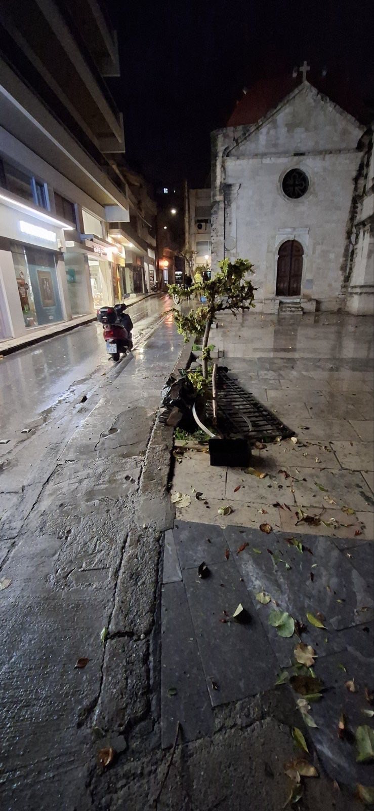 Νωρίτερα, οι ισχυροί άνεμοι έριξαν μεγάλο δέντρο και στην πλατεία Κορνάρου, προκαλώντας αναστάτωση στην περιοχή.