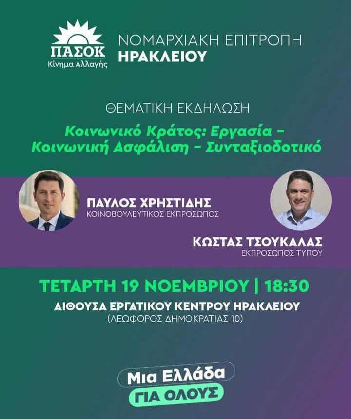 Στο Ηράκλειο, η θεματική εκδήλωση του ΠΑΣΟΚ – Κινήματος Αλλαγής με τίτλο «Κοινωνικό Κράτος: Εργασία – Κοινωνική Ασφάλιση – Συνταξιοδοτικό», που θα πραγματοποιηθεί την Τετάρτη 19 Νοεμβρίου στις 18:30 στην Αίθουσα του Εργατικού Κέντρου Ηρακλείου, φαίνεται πως συγκεντρώνει μεγαλύτερο ενδιαφέρον απ’ όσο αφήνει να φανεί το επίσημο πρόγραμμα.
