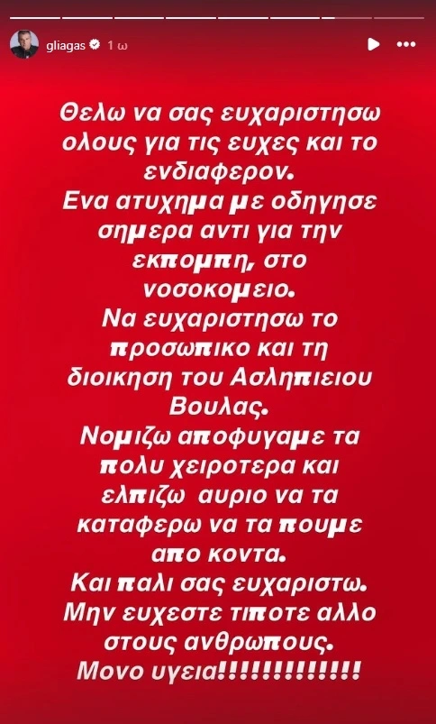 «Θέλω να σας ευχαριστήσω όλους για τις ευχές και το ενδιαφέρον. Ένα ατύχημα με οδήγησε σήμερα αντί για την εκπομπή στο νοσοκομείο. Να ευχαριστήσω το προσωπικό και τη διοίκηση του Ασκληπιού Βούλας. Νομίζω αποφύγαμε τα πολύ χειρότερα και ελπίζω αύριο να τα καταφέρω να τα πούμε από κοντά. Και πάλι σας ευχαριστώ. Μην εύχεστε τίποτα άλλο στους ανθρώπους. Μόνο υγεία!», έγραψε χαρακτηριστικά, δίνοντας το στίγμα της κατάστασής του.